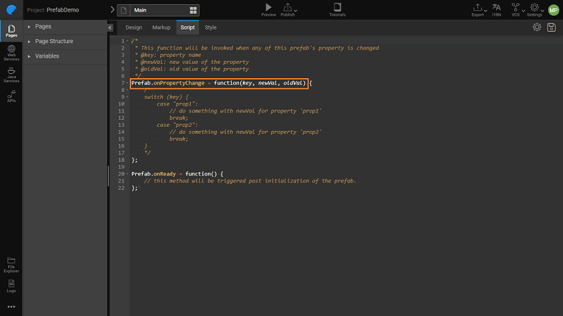- Once the Prefab properties are set, a onPropertyChange event is created, which can be programmed from the Script.