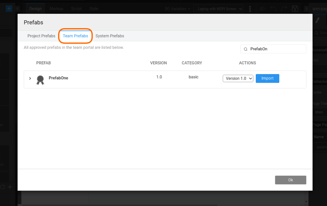 After the Admin's approval, these Prefabs will be available for import from Prefabs dialog under Artifacts dropdown.