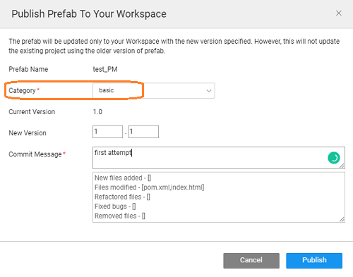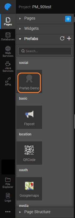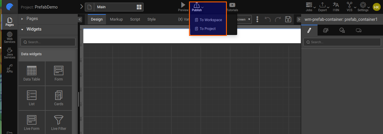 Using the Publish to Workspace option from the Main Menu listed under the app name, you can make your Prefab available across all projects within your workspace. Once Published the Prefab will be displayed in the Prefab section of the Widgets Panel under the category specified at the time of publishing.
