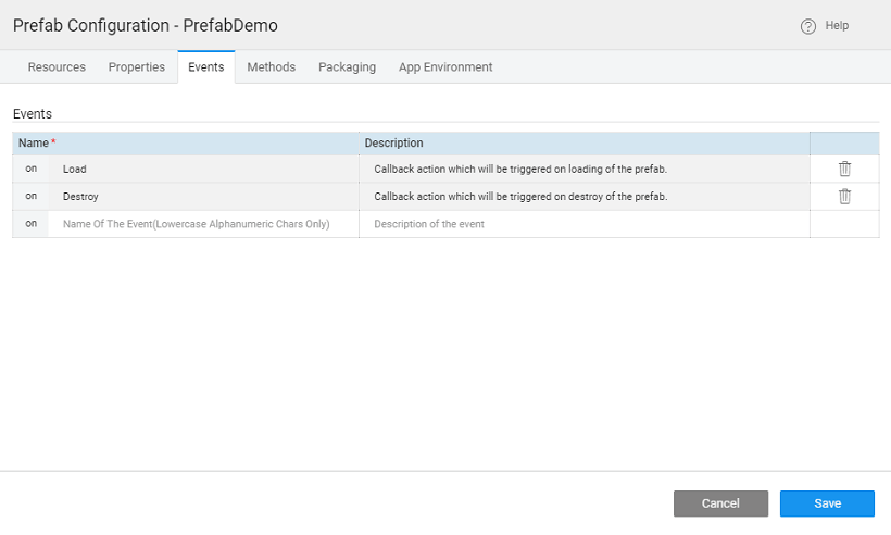 You can define events that can be handled by the developers using the Prefab. These events will be exposed under the events tab when the developer uses the Prefab, the developer can handle these events as per their requirements. By default, two events are defined - onLoad