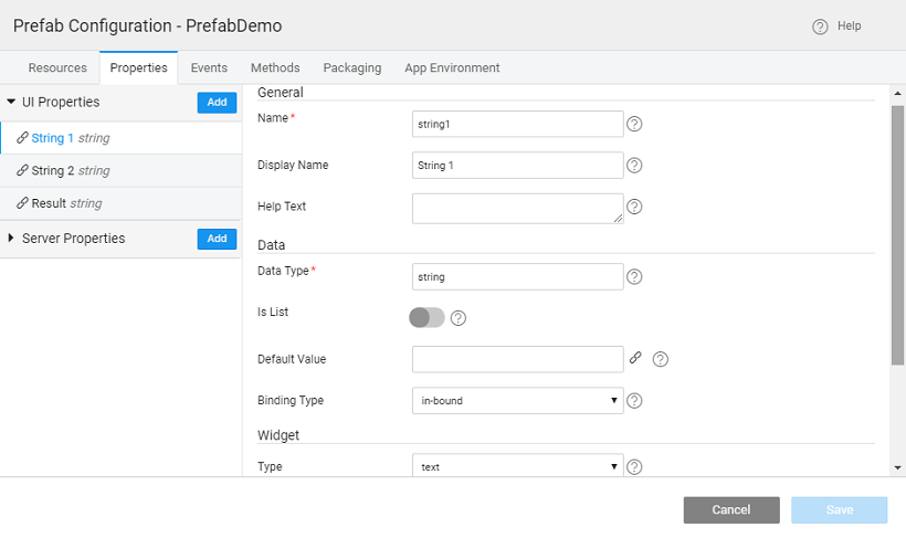 Users can add Prefab properties, which are exposed to the developers using the Prefab. These properties can take some input from the app(inbound) or give some output to the app(outbound) or both. These properties are defined in the Prefab scope. These properties will be displayed in the properties panel when the user uses the Prefab. The properties are further classified into UI and Server properties.