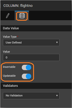 The Insertable and Updatable options can be configured for User Defined and Server Defined value types for Database columns. For Database Defined value type these are implicitly set to false. Insertable and Updatable options are provided under Data Value group for the columns in the Database Designer.