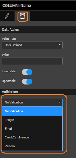 There may be situations where you might want to set validations for user-defined columns. This can be achieved by an option to select the validation from the list of default validators list for the column based on the data type. This option is available on the properties panel for the selected column.