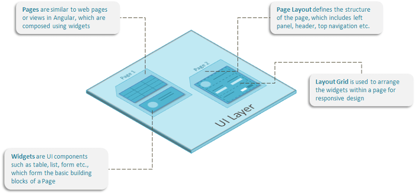 After the backend services and the model are generated, UI layer is built by creating pages. Pages are composed with widgets and the Page Layout defines the structure of a page i.e. header, left panel, top navigation etc.