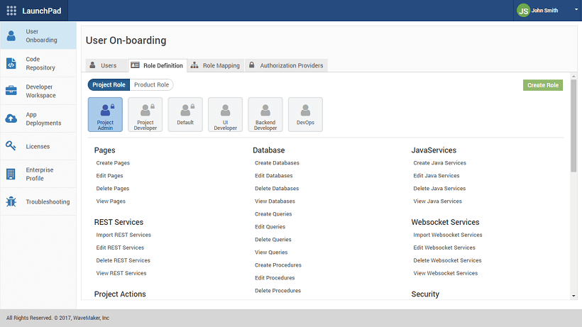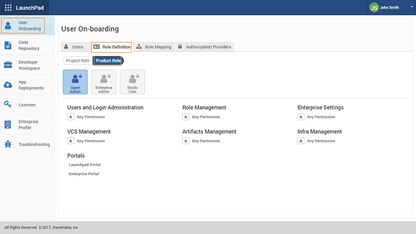Launchpad Role Definitions: Roles can be created from the Role Definition tab of the User On-boarding section of Launchpad. As mentioned earlier the Product Roles are pre-defined with permissions set and they cannot be modified. Project Roles come with a pre-defined roles of Project Admin, Project Developer and Default.