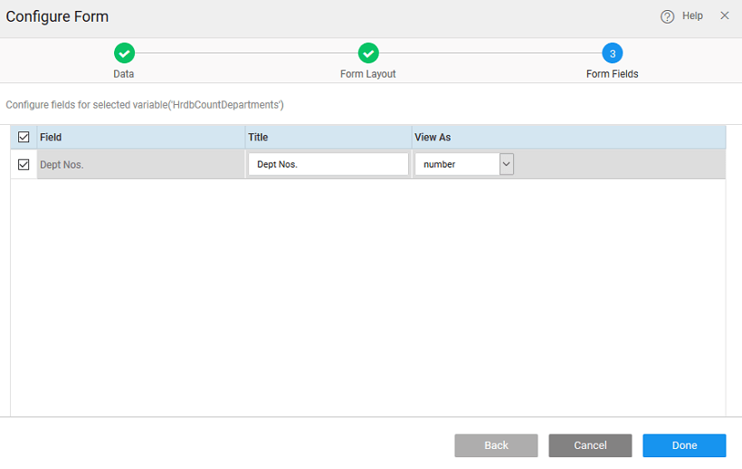 3. Select Layout and Configure Fields changing the display name and widget type if needed. Note that if the database API Variable underlying the Form, has to have some input fields the same should be done using the Data tab of the Variable.