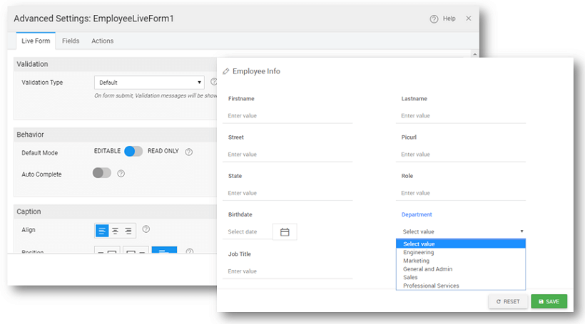 Live Form widget provides a columnar group of input elements for user entry. Live Form can be bound to a database through Database CRUD variables and can be used to perform CRUD operations on the underlying database via REST API call. These CRUD APIs are auto-generated at the time of Database Integration.