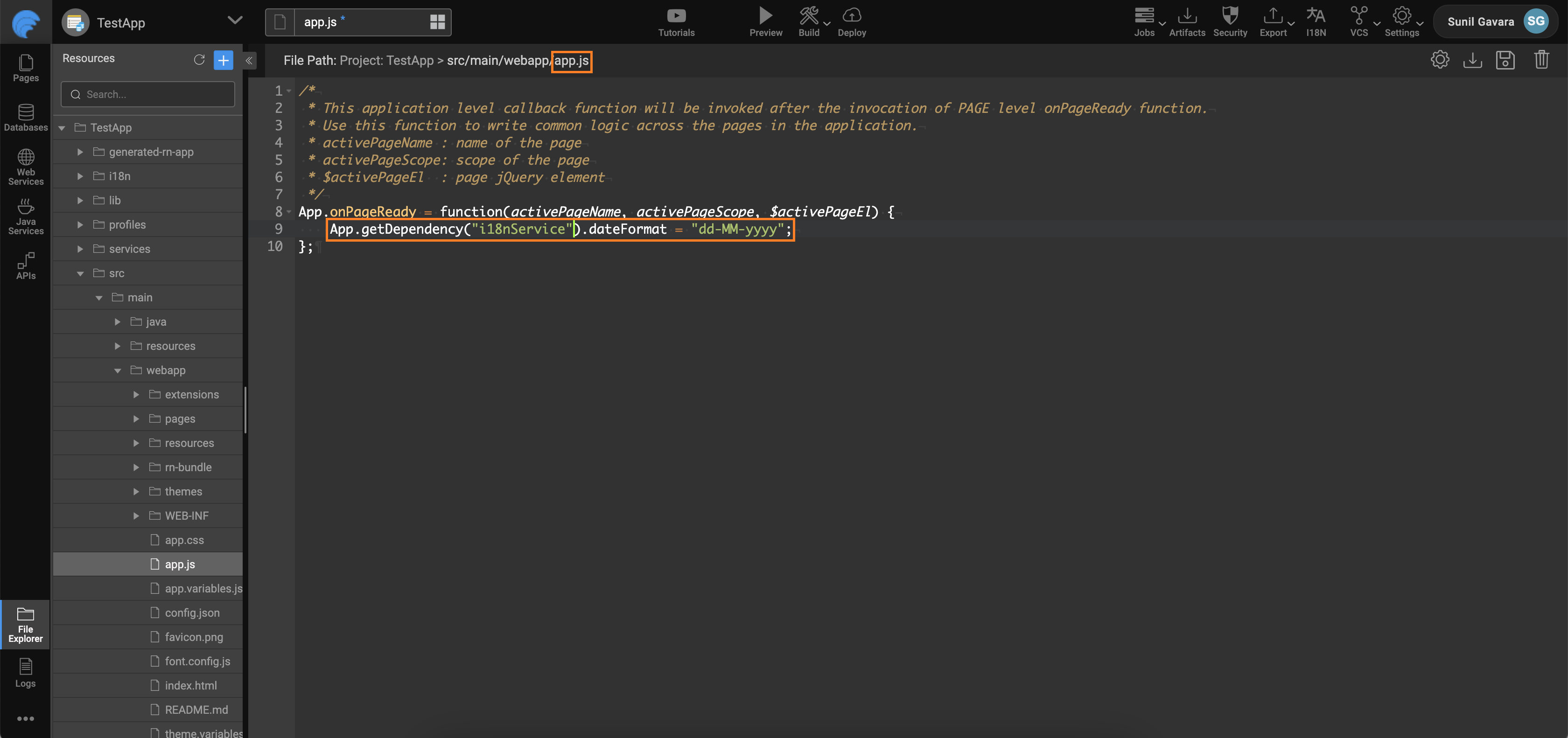 With release 11.8.0, you can now update the date format for Internationalization (i18n) service through JavaScript as well. Use the below code to update, App.getDependency(“i18nService”).dateFormat = “dd-MM-yyyy”;.