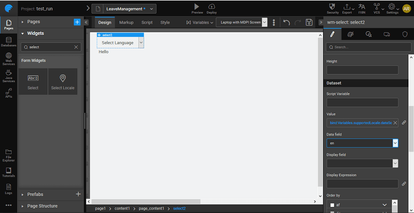 2. When the user selects a Language on your application or when you set the default language of the app from the Project Settings dialog, WaveMaker applies the relevant locale settings to show the messages as per its value for that locale.