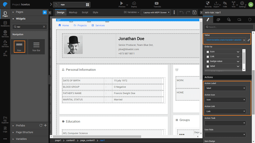 1. Bind the Value property of the Menu widget to the variable created in the previous step.