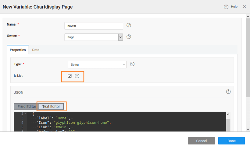 1. Create a new Model Variable called as navvar and select isList.