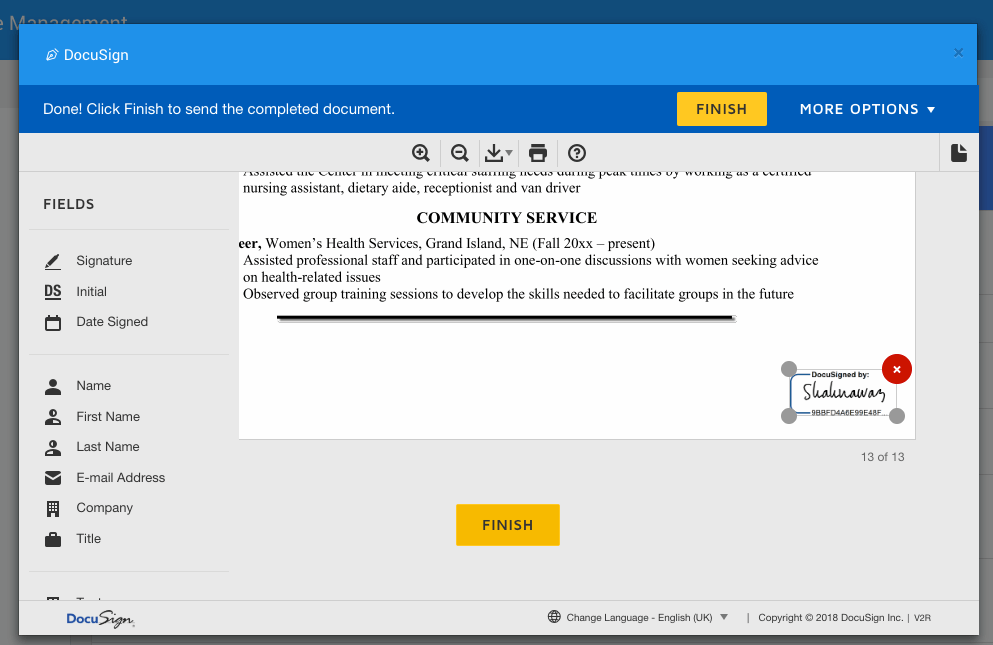 With the above steps done your Docusign prefab integration is complete. Now clicking on the E-sign link will invoke a Docusign dialogue and the your document will appear in the dialogue. Click continue to start the e-signing process. Click on the e-signing options from the left menu and e-sign the document. Then click finish button in the popup to complete the process.