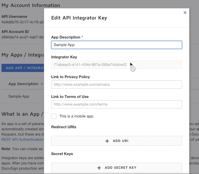 - Integrator Key: Provide the Integrator Key derived for your Docusign App from the Docusign Admin console.