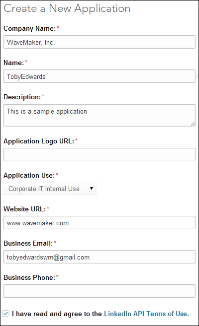 - Enter Company Name, Name, Description, Application Logo URL, Application Use, Website URL, Business Email and Business Phone in their respective fields. Check the LinkedIn API Terms of Use checkbox and click Submit. Authorize Redirect URLs page is displayed.