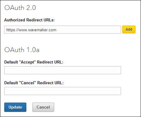- Enter a valid sample Authorized Redirect URLs below OAuth 2.0 and click Add. Click Update. Your application is successfully created.