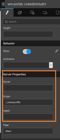 In the Properties Panel, below SERVER PROPERTIES, enter the Appid, Page, Scope and Secret in their respective fields.