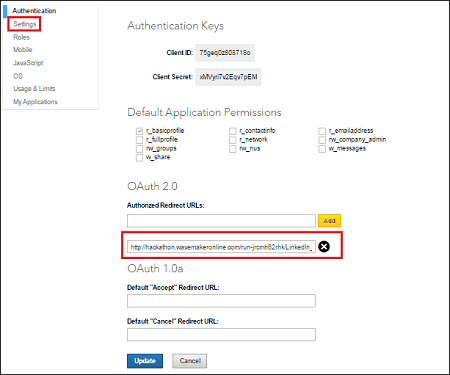 Go to LinkedIn Developers – your project page and click on Settings on the left side. Add the generated redirect URL below OAuth 2.0 and Click Update.