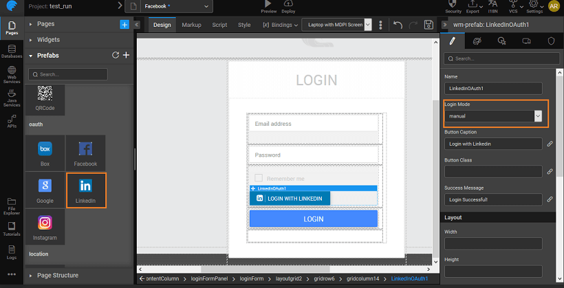 Drag and Drop the LinkedIn Prefab from the Prefabs Tab under OAuth.You can use the default login page created by WaveMaker.