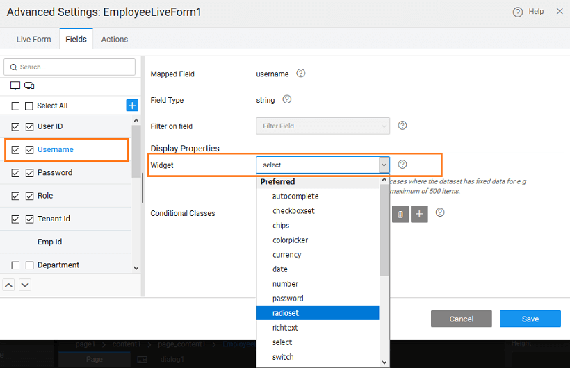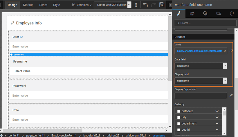 • The form field can be bind to any other variable. Note that datafield should be set as ‘All Fields’. As this is a foreign key, it expects an object. Here we have changed the binding to the Live Variable for Employee table and the display field has been set to lastname.
