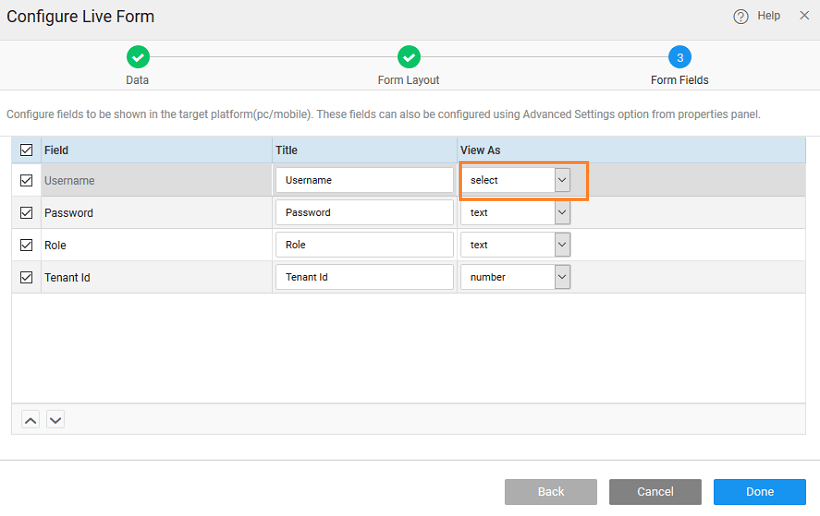 3. Drag and drop the fields corresponding to Username, Password and Role from the Live Form into the respective gridcolumns.