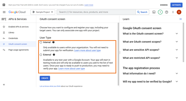 1. In OAuth consent screen, select the User Type to restrict the user accounts to access the application.