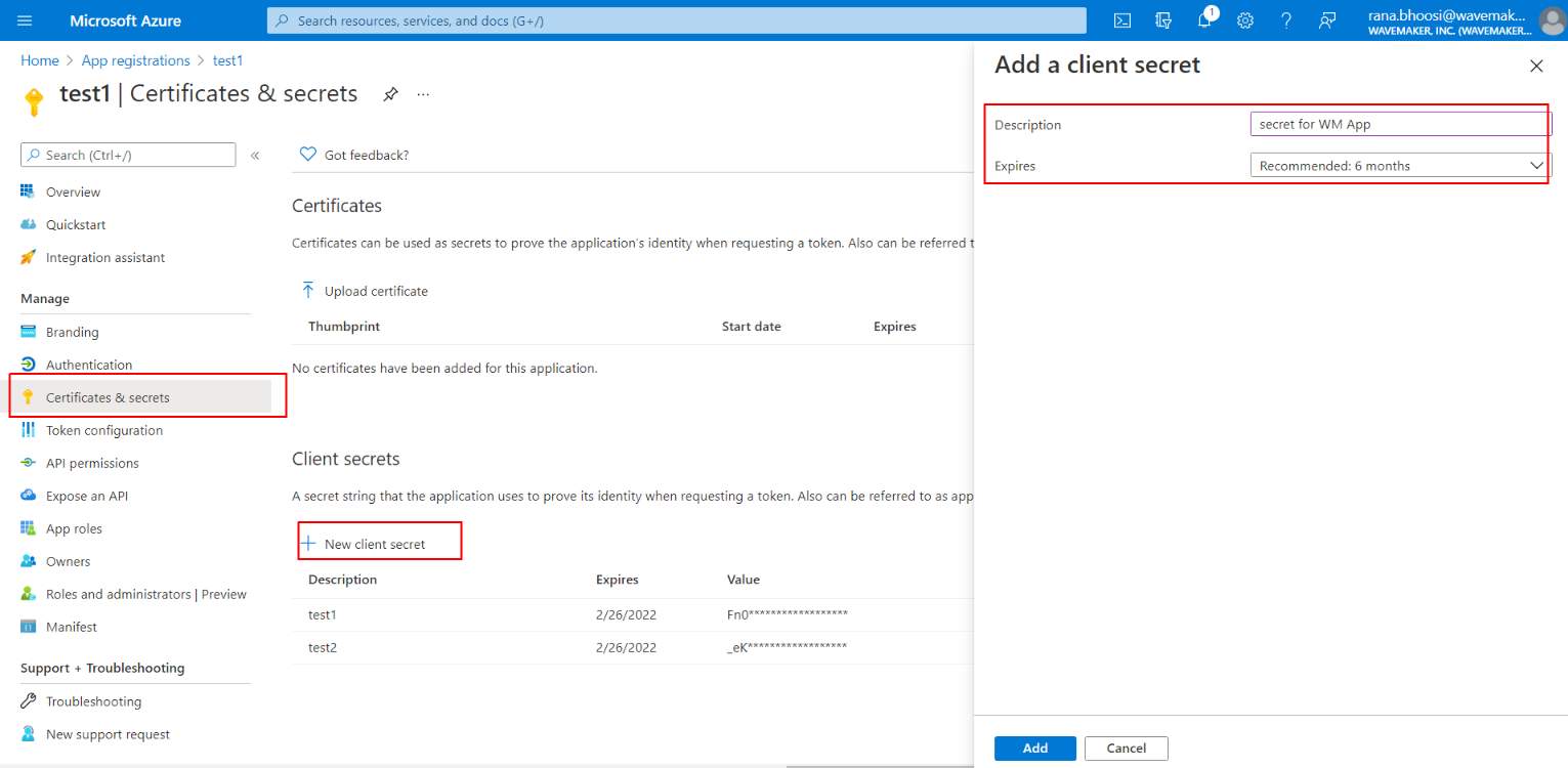1. In the left panel under App Registration, click Certificates and Secrets then Create New Client Secret and copy the secret value.