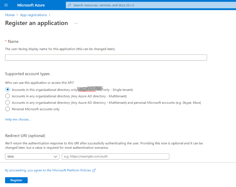 1. On the App Registrations screen, click New Registration and provide the app name, account type, and redirect URI.