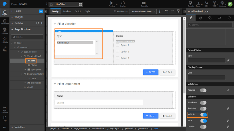 Bind the Live Filter to Database CRUD Variable with hrdb as Service and Vacation as Entity.