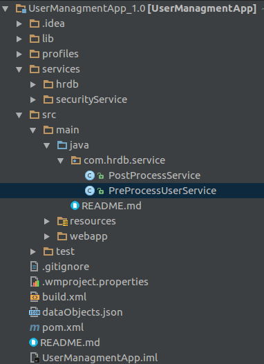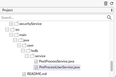 - Create a service in user src/main/java folder of the project Example: UserManagementApp/src/main/java/com/hrdb/service/PreProcessUserService.java