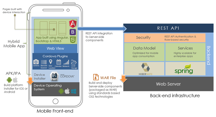 The mobile front-end is developed just like the way Pages are created in Web applications by making use of layouts and Variables for services integration. REST APIs are used for integration with backend services such as Database, Web Services or Java Services. Front end components are packaged into an installer and the backend services developed using WaveMaker should be deployed to any standards-based web server.
