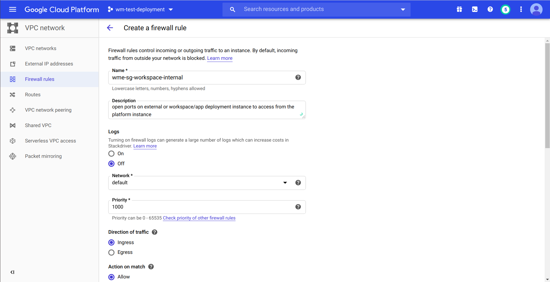 • At network section provide respected network tags of your firewall if you using source and target tags at firewall rules and create Instance.