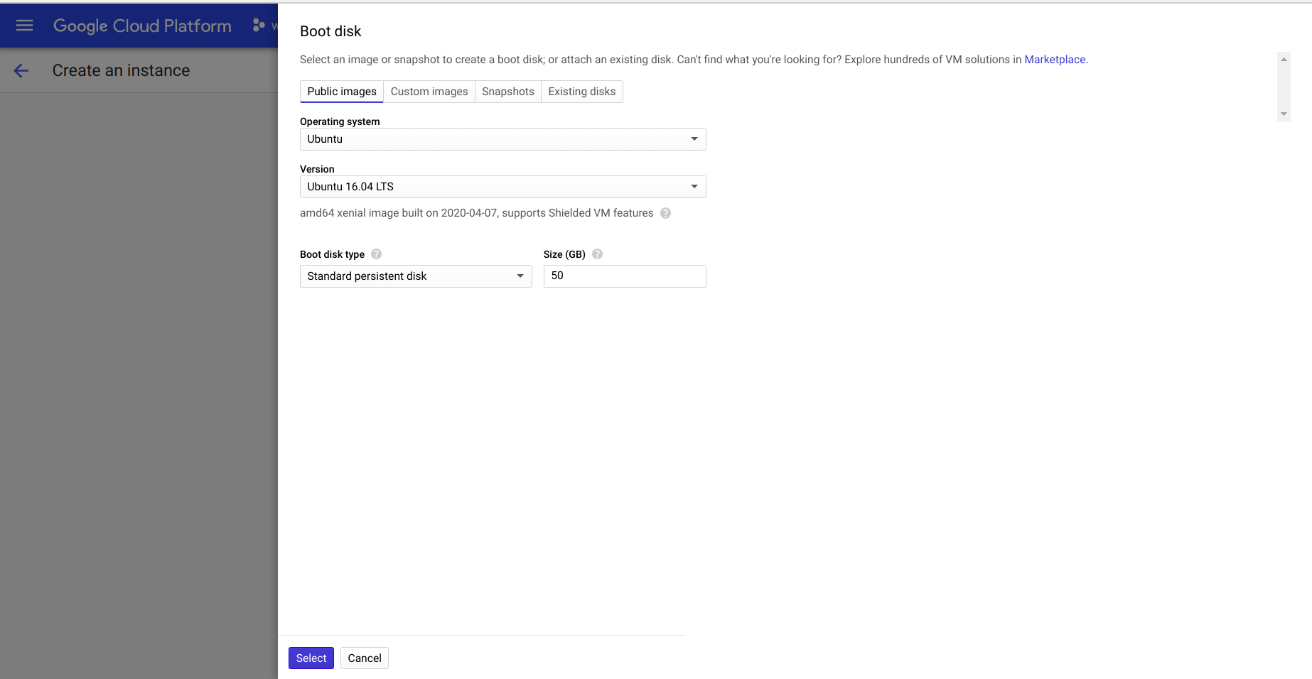 • Select image or snapshot for creating boot disk.select operating system as ubuntu and version as ubuntu 16.04 LTS.
