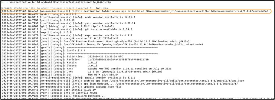 wm-reactnative-cli command prints the destination build folder at the beginning of build logs.