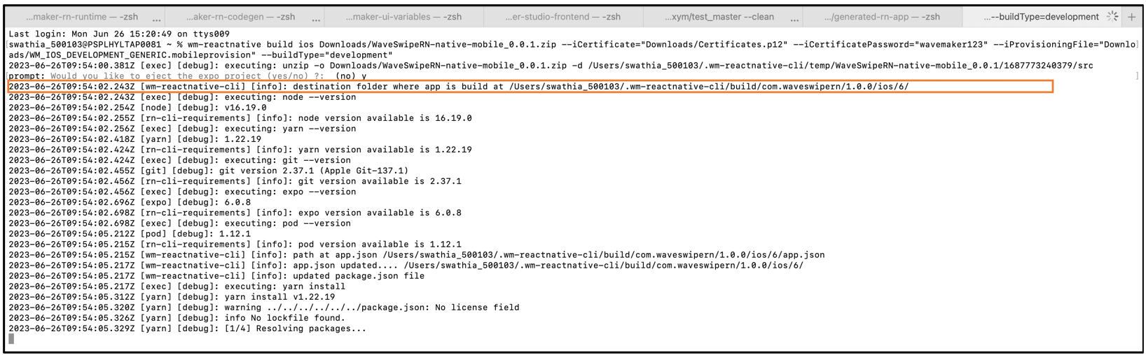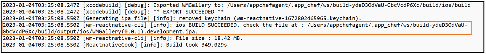 When the build gets completed, wm-reactnative-cli prints out the path at which the generated IPA is present.