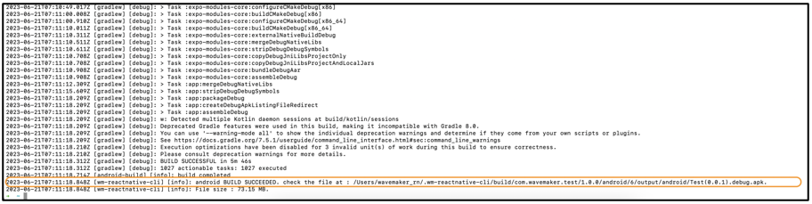 When the build gets completed, wm-reactnative-cli prints out the path at which the generated APK is present.