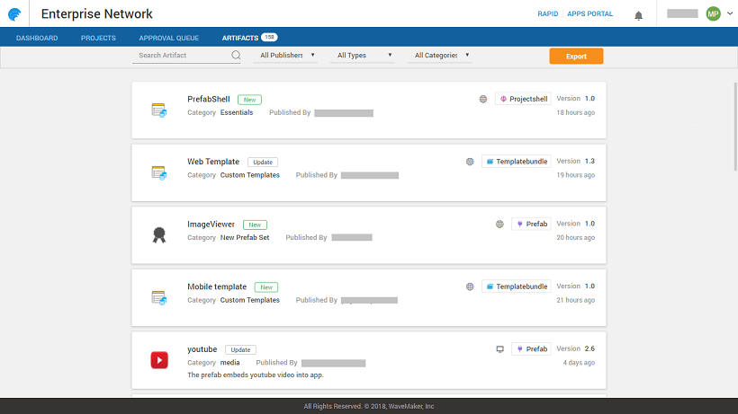 Artifact Repository is a collection of artifacts or resources used across application development lifecycle in WaveMaker platform. It allows for easy exploration and discovery of Artifacts available to the developer network. These artifacts include: