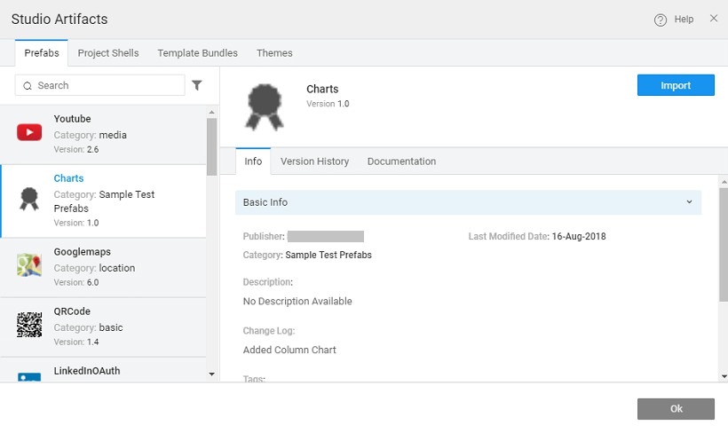 - Publish Info: This requires the Developer to enter the Category, Version, and Change Log. In case this Artifact uses or has a dependency on other Artifacts (for example, Project Shell using a Prefab), the dependencies are listed here.