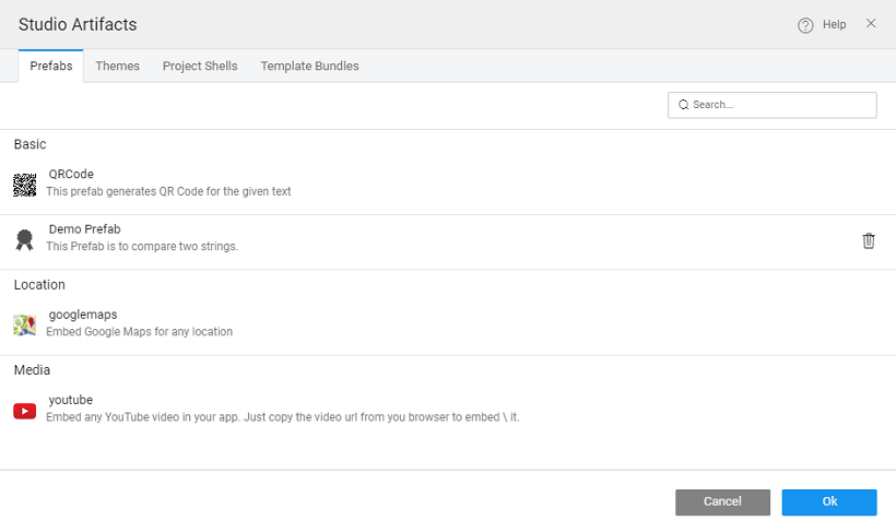 - Prefabs: Prefabs are a collection of one or more widgets that are bound to APIs or services.