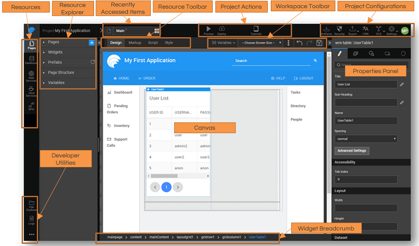 - Workspace Toolbar helps in defining runtime functionality of the Page in terms of Variables, Themes, Layout etc..