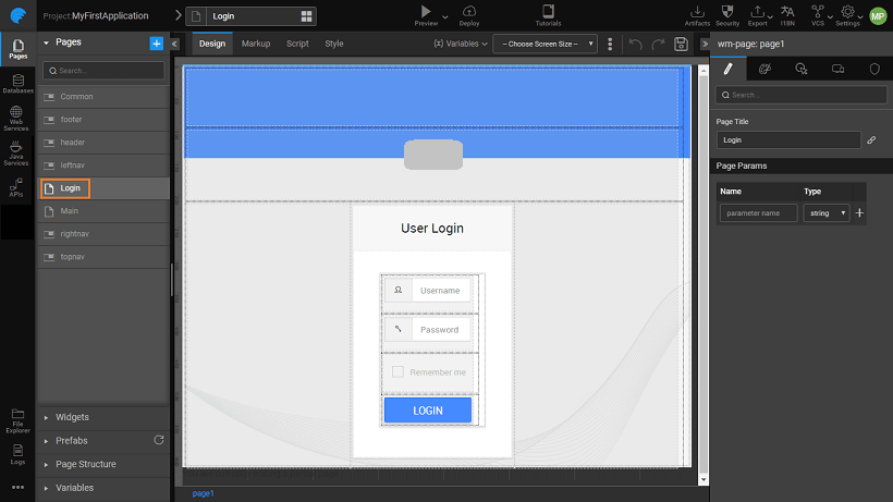 - Select the page container and change the Class name and Image location from the Style property to change the background image and style